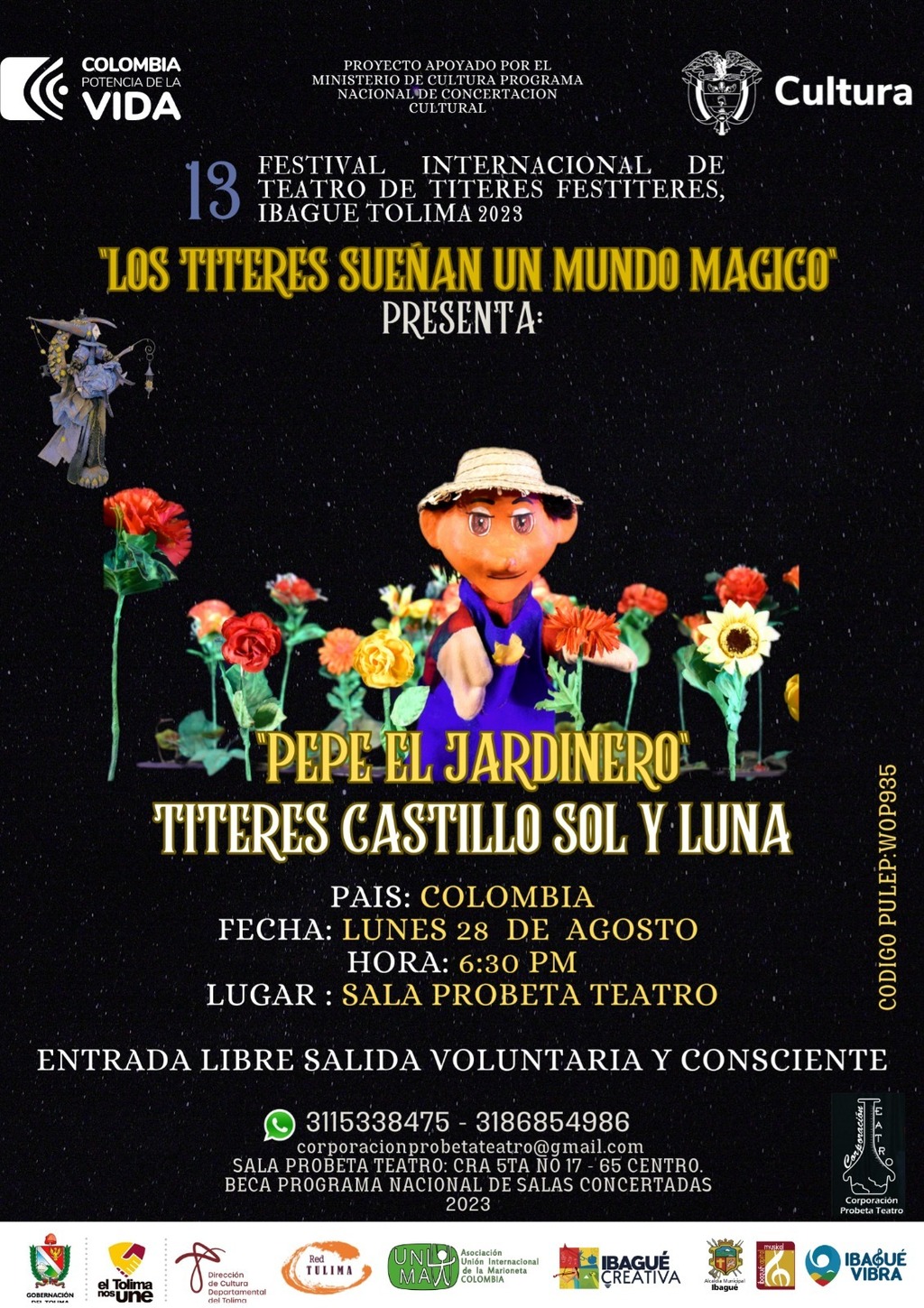 Dentro del marco del Festival Internacional de Teatro de Títeres Festíteres, Ibagué del 2023, la obra se realizará el lunes 28 de agosto, en la sala Probeta Teatro por el colectivo Títeres Castillo Sol y Luna. Es de entrada libre y de salida voluntaria y consciente. Para mayor información escribir los números de Whatsapp que se resaltan en el afiche.